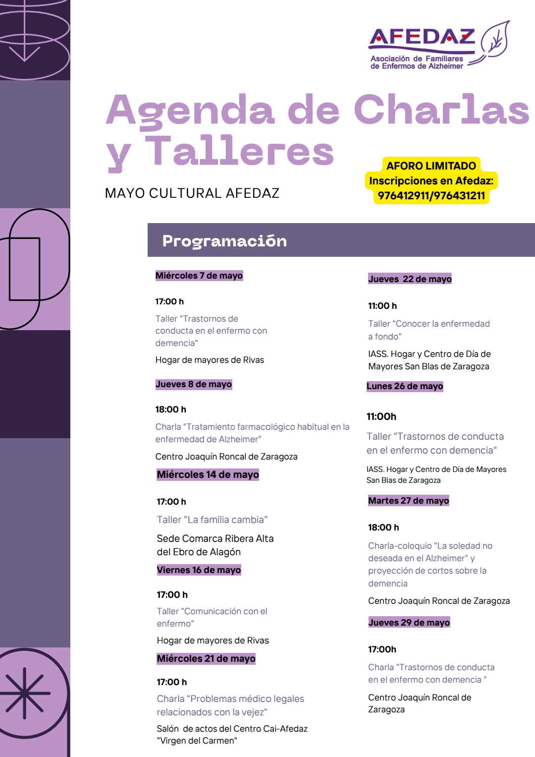 Os recordamos que son con aforo limitado, por lo tanto podéis apuntaros a través del teléfono del centro 976431211 o mandando un correo a info@afedaz.es