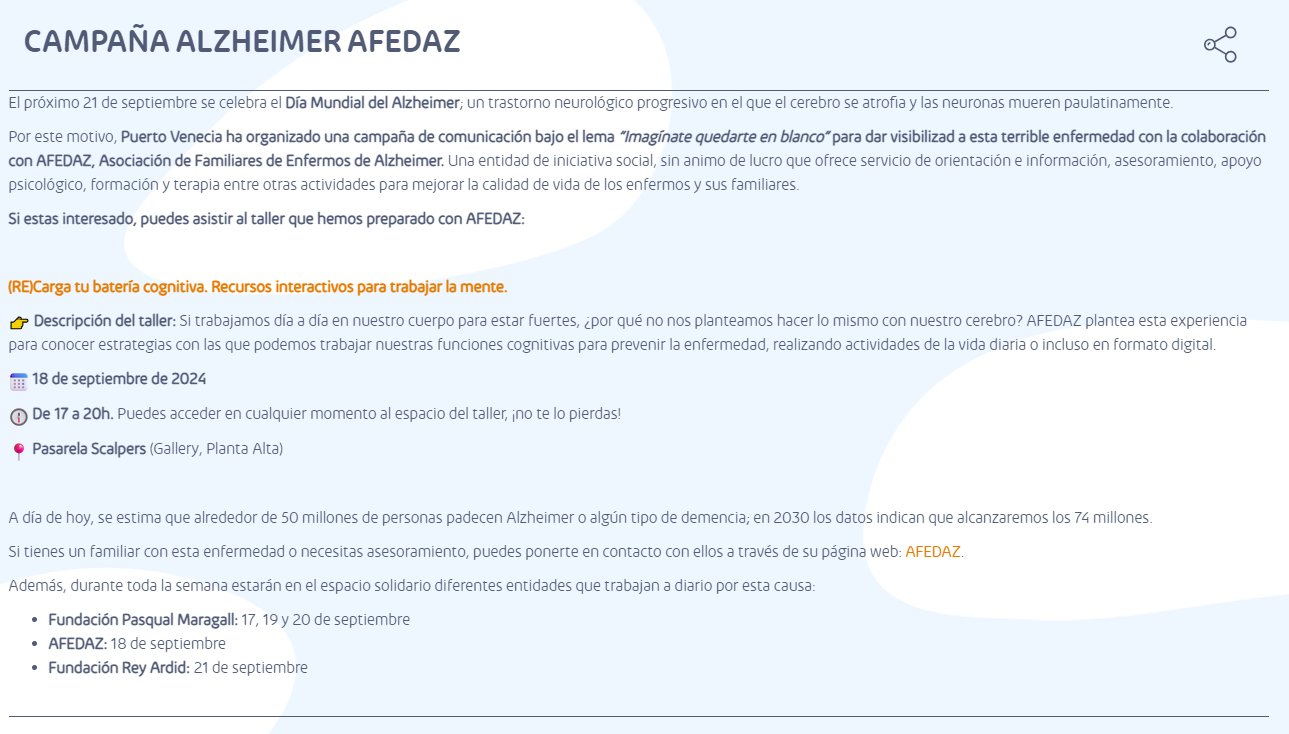 Por este motivo, Puerto Venecia ha organizado una campaña de comunicación bajo el lema “Imagínate quedarte en blanco” para dar visibilizad a esta terrible enfermedad con la colaboración con AFEDAZ, Asociación de Familiares de Enfermos de Alzheimer. Una entidad de iniciativa social, sin animo de lucro que ofrece servicio de orientación e información, asesoramiento, apoyo psicológico, formación y terapia entre otras actividades para mejorar la calidad de vida de los enfermos y sus familiares.